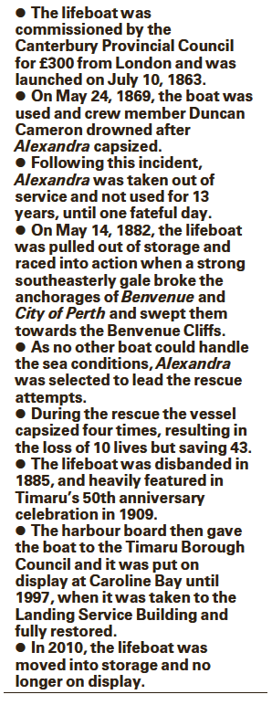 The lifeboat is primarily remembered for its use during the infamous ‘‘Black Sunday’’ wrecks in 1882, when a strong southeasterly gale broke the anchorages of Benvenue and City of Perth and swept them towards the Benvenue Cliffs.