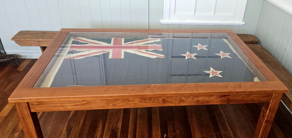 Mrs Ryan said after consulting with the South Canterbury Museum on the best way to display and preserve the at least 80-year-old flag, a special table was built by local joiner Dave Carter to house it.