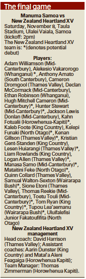 The New Zealand Heartland XV plays the final game of their two-match tour of Samoa on Saturday.